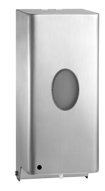 Dartmouth touch-free soap dispenser for wall mounting, manufactured from grade 304 stainless steel with a satin finish, inspection window on front, infrared sensor activity for non-touch