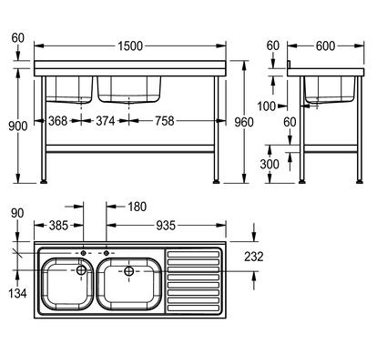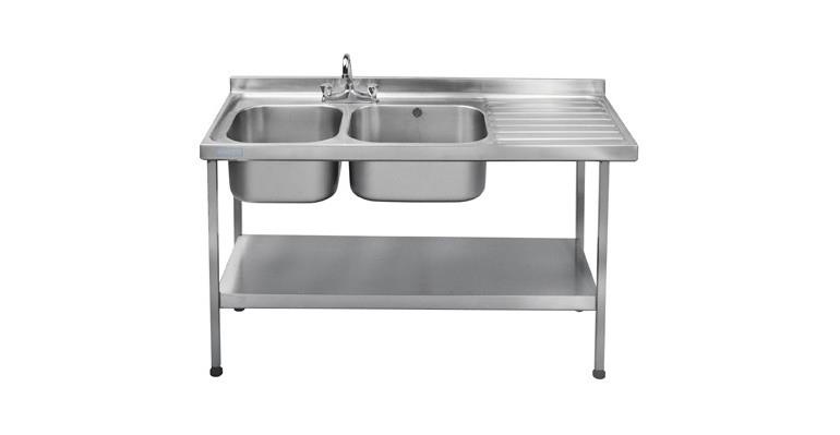 Mini catering sink 1500mm x 600mm with double bowl and right hand drainer. Manufactured from 1.2mm thick, grade 1.4301 (304) stainless steel, with a satin finish. Designed with tap holes drilled for mixer taps only. An earthing lug is fitted under the drainer. Stainless steel underframes and shelf (sold separately) are supplied in a flat pack form with easy to read assembly instructions. Each leg is fitted with an adjustable foot (-20, +10mm) with a working height of 900mm. The sink is supplied with a 38mm waste, plug, chain and overflow.