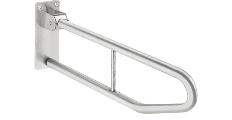 Foldable grab rail without toilet roll holder for wall mounting, stainless steel, surface satin finished, rough polishing for better surface feel, 32mm pipe diameter, material thickness 1.2mm, prevention against unmeant folding, gum rubber stop absorber, inspected and certified product, 4mm thick mounting plate with three fixing holes, including stainless steel screws and dowels.