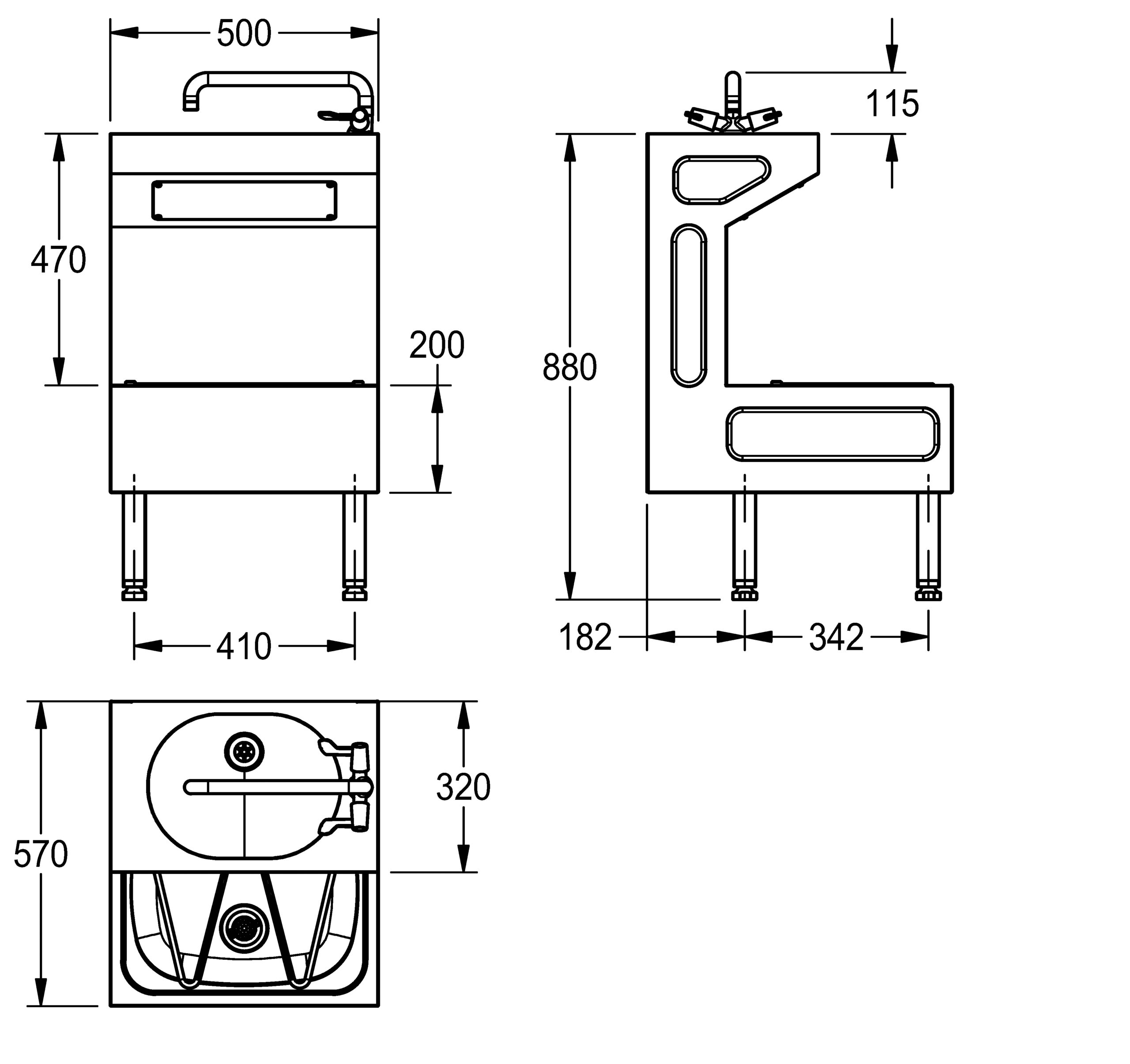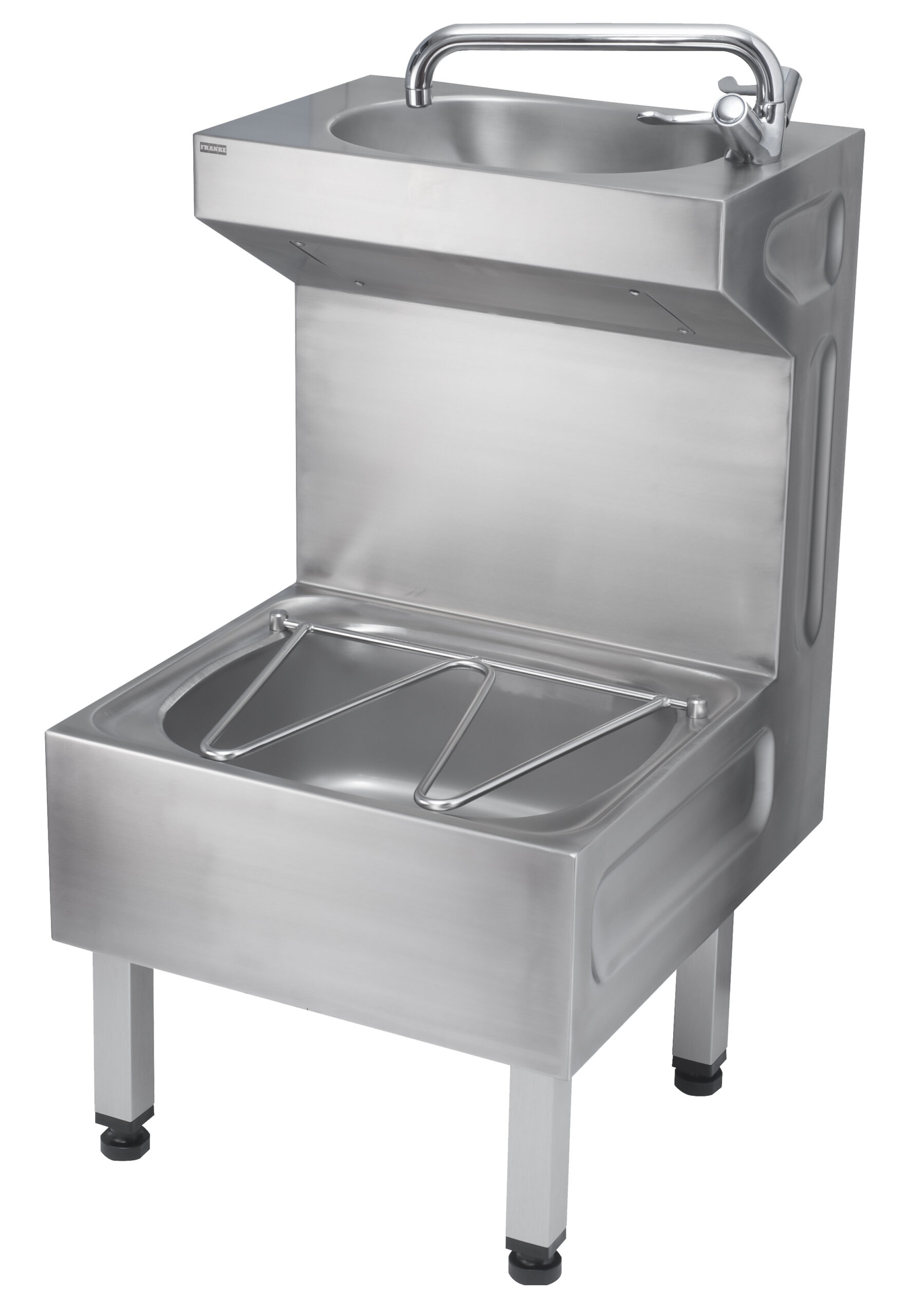Floor standing healthcare compliant janitorial unit. Manufactured from 1.2mm thick, grade 1.4301 (304) stainless steel (except for lower bowl – 0.9mm). Supplied complete with lever operated monobloc mixer, copper tails, 32mm flush grated waste outlet for top wash bowl and 38mm domed waste (for lower bowl). The janitorial unit can be fixed with 4 legs for floor standing or part wall hung / floor standing by using two of the front legs or alternatively can be fitted as a wall hung unit by using the joggle strip provided. Manufactured in accordance with HTM 64 / HBN 00-10, Part C Standards.
