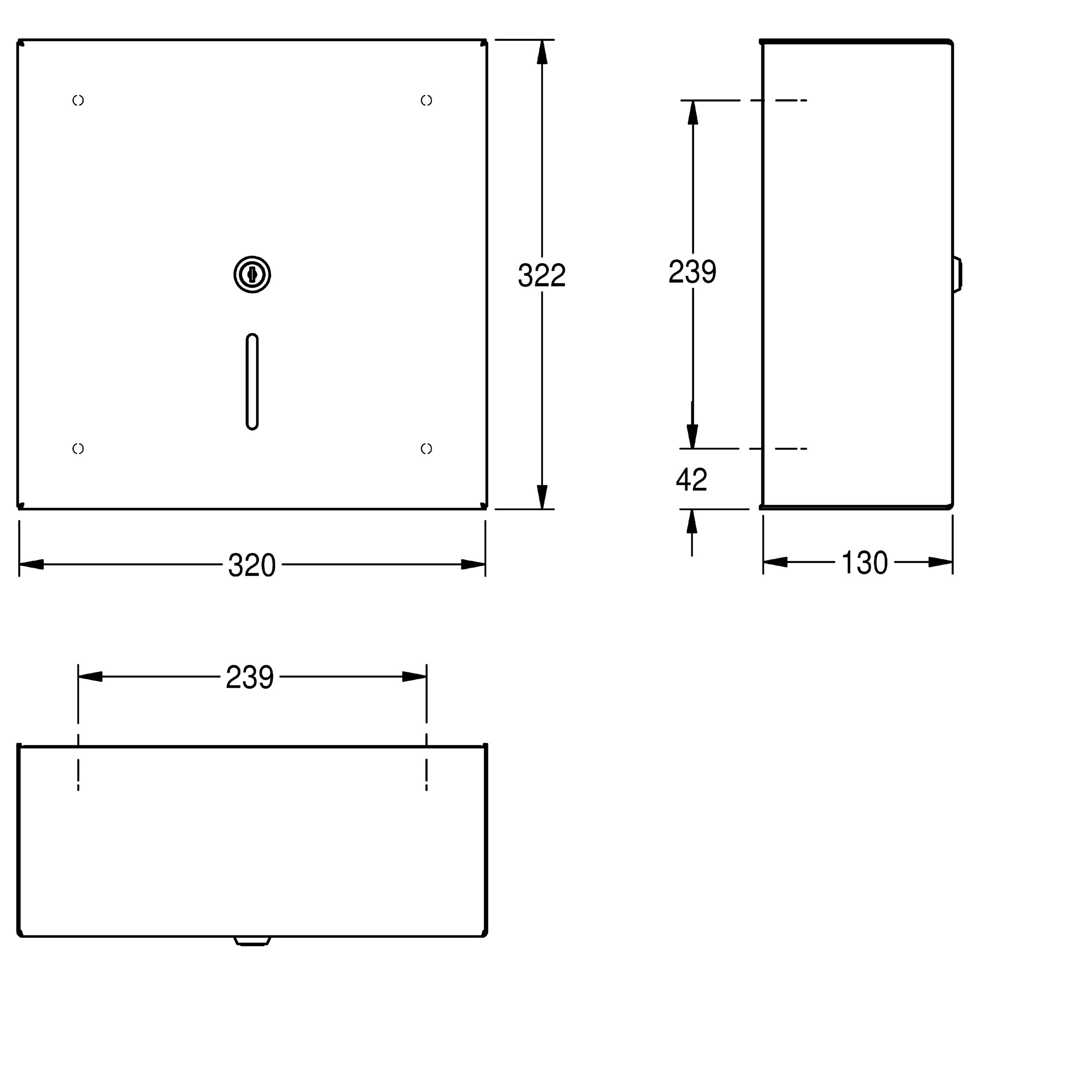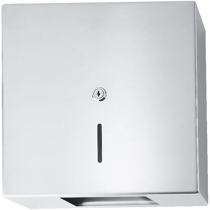Heavy duty wall mounted jumbo toilet roll holder. Manufactured from 2mm thick grade 1.4301 (304) stainless steel with a satin polish finish. The casing is held in place by a stainless steel rod fixed to the mounting plate and a security lock. Suitable for rolls with a maximum diameter of 300mm the square outer case has an inspection window to the front, and an integrated stainless steel tear-off edges. Fixings are included.