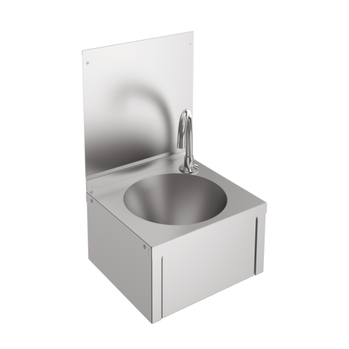 Knee operated wash basin is manufactured from stainless steel – satin polish finish, material thickness 0.9mm. Supplied complete with water spout positioned in rear right hand corner and 32mm waste outlet. Note: The pre-mixing valve and the pipework linking the water spout to the knee operated front panel is all supplied with the washbasin. Wall mounted by fitting a top joggle strip under the upstand return and by screw fixing through the integral rear brackets. Screws and plugs are not supplied.