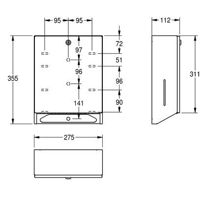 Paper towel dispenser for wall mounting, stainless steel, surface satin finished, material thickness 0.8 mm, folded front cover, cylinder lock with KWC standard key, inspection windows on sides, loading capacity 500 – 800 pcs. of paper depending on convolution, incl. stainless steel screws and dowels.
