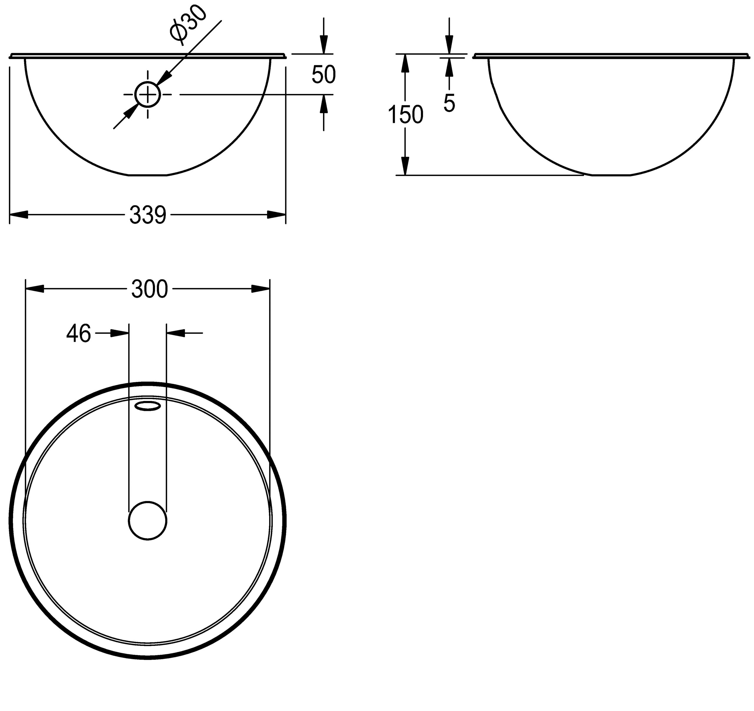 Round inset vanity basin, can be mounted from top or underneath, stainless steel, material thickness 1 mm, bowl diameter 300 mm, with overflow, incl. 5/4″ overflow kit without waste, stainless steel lugs for underneath mounting are included. Out cut diameter for mounting from top: 319 mm, out cut diameter for mounting from underneath: 290 mm surface high-polished.