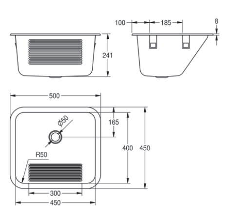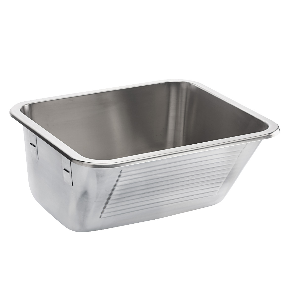 General purpose utility sink for inset mounting, stainless steel, surface satin finished, material thickness 0.9 mm, front panel with riffle, 1 1/2” flat perforated waste, incl. washer and clamps for inset mounting.