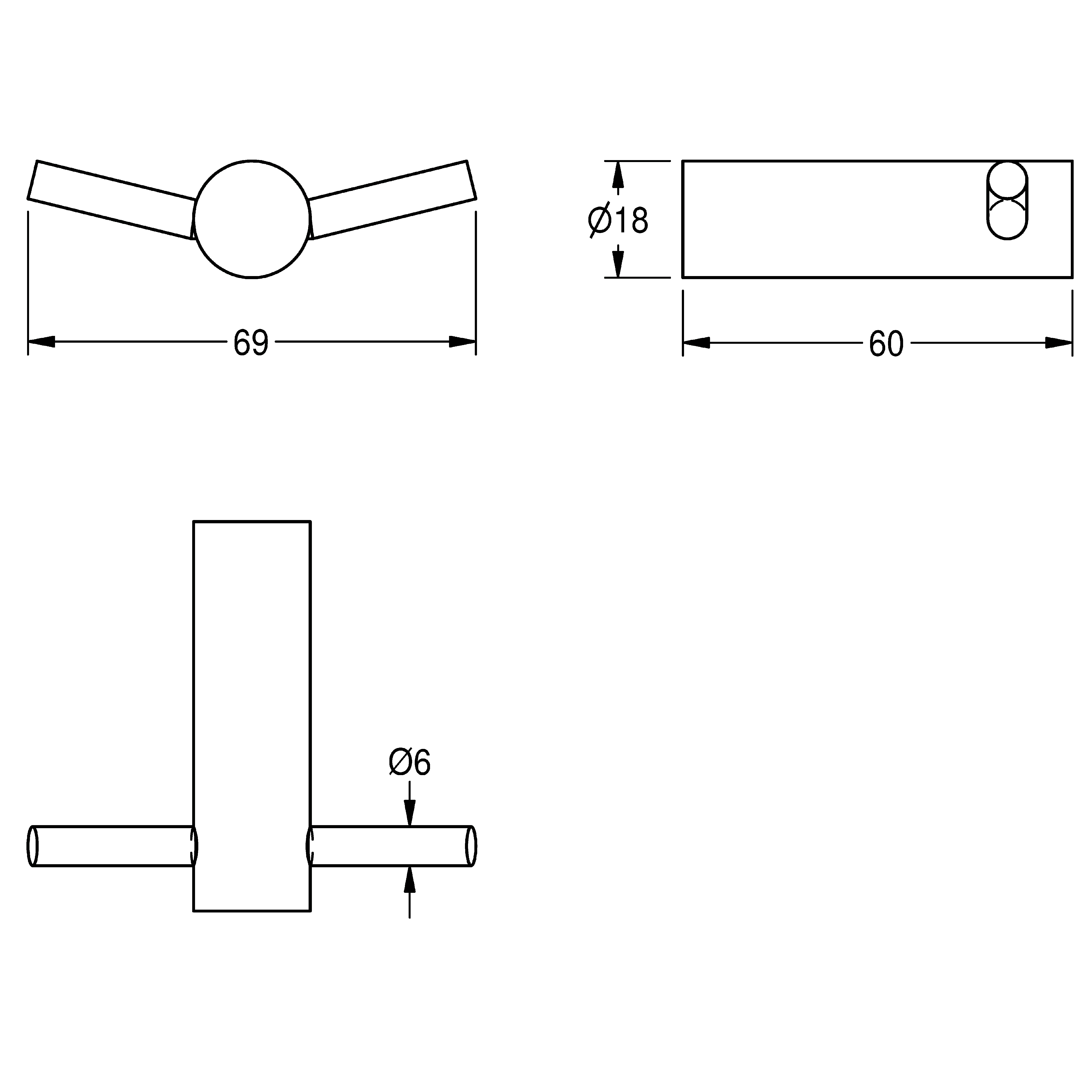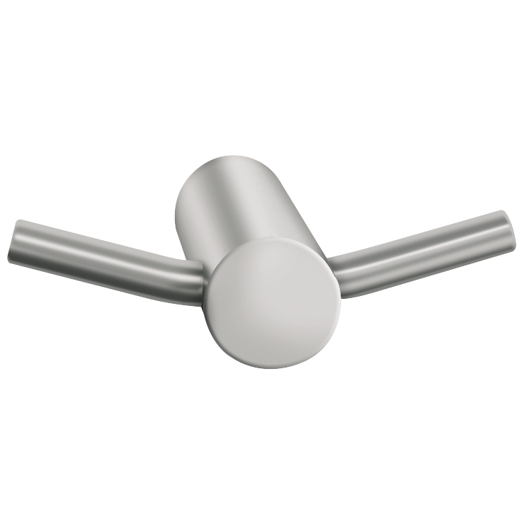 Double hook for wall mounting, stainless steel, surface satin finished, 18 mm pipe diameter, drilled hole on bottom for fixation, includes stainless steel screws and dowels.