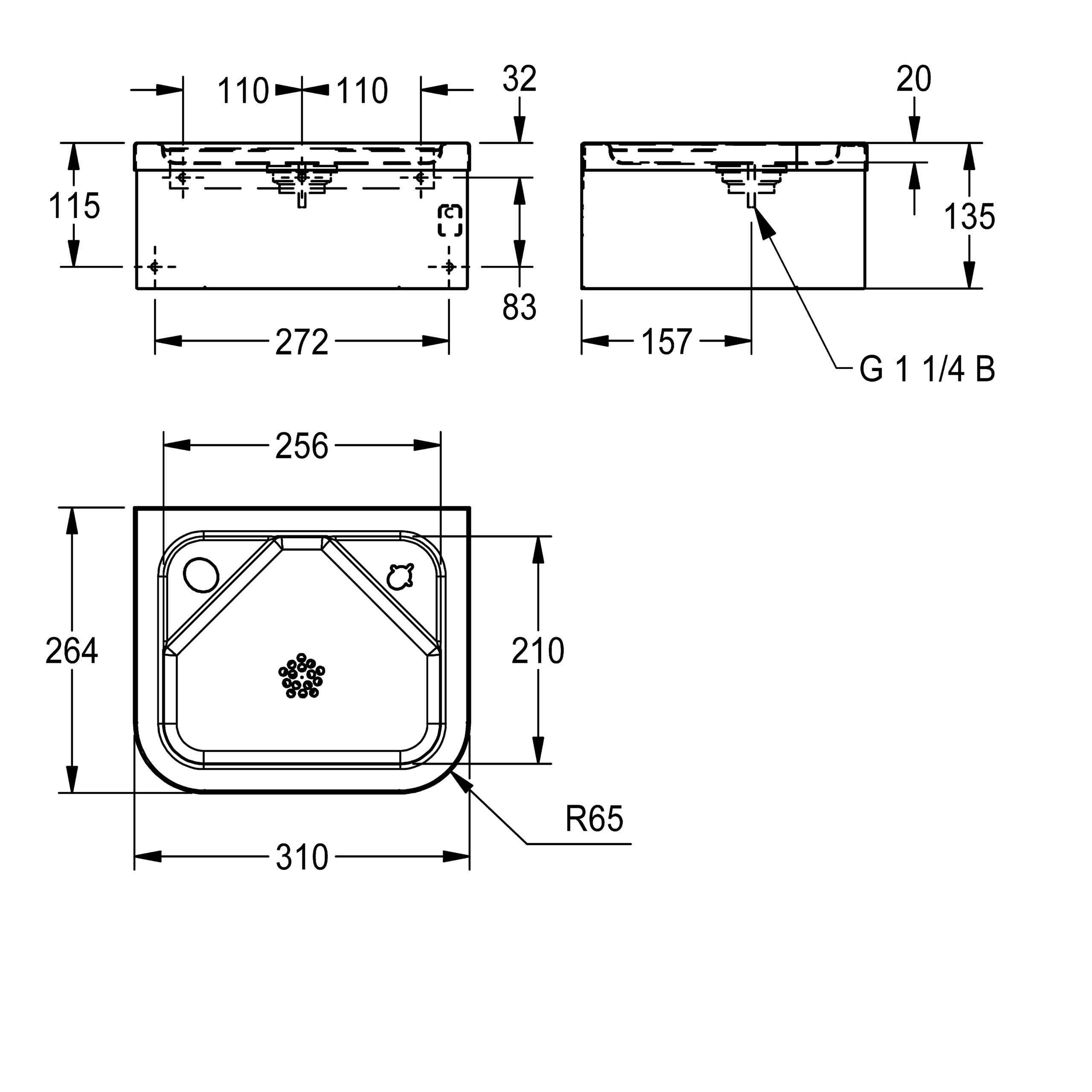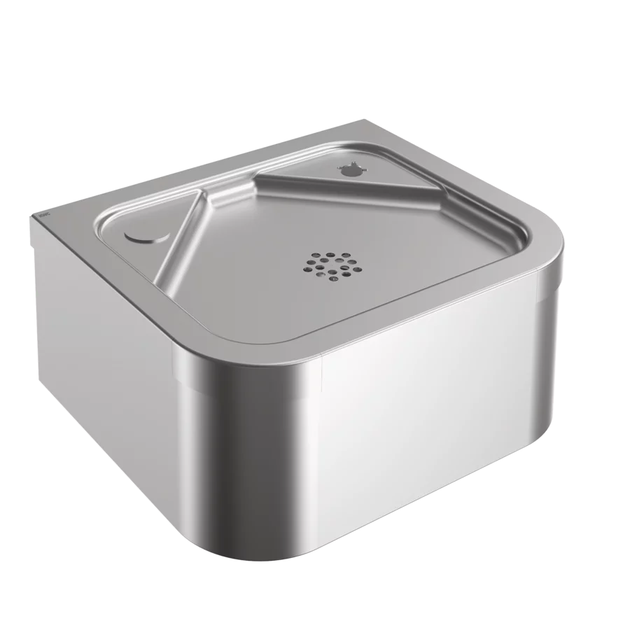 ANIMA wall-mounted drinking fountain, stainless steel, satin finished surface, material thickness 1.2mm, seamlessly integrated flat bowl without overflow, rectangular drinking fountain shape with rounded edges, two tap holes including cover, circumferential apron with material thickness 1mm, strainer waste G 1 1/4 B, including mounting material.